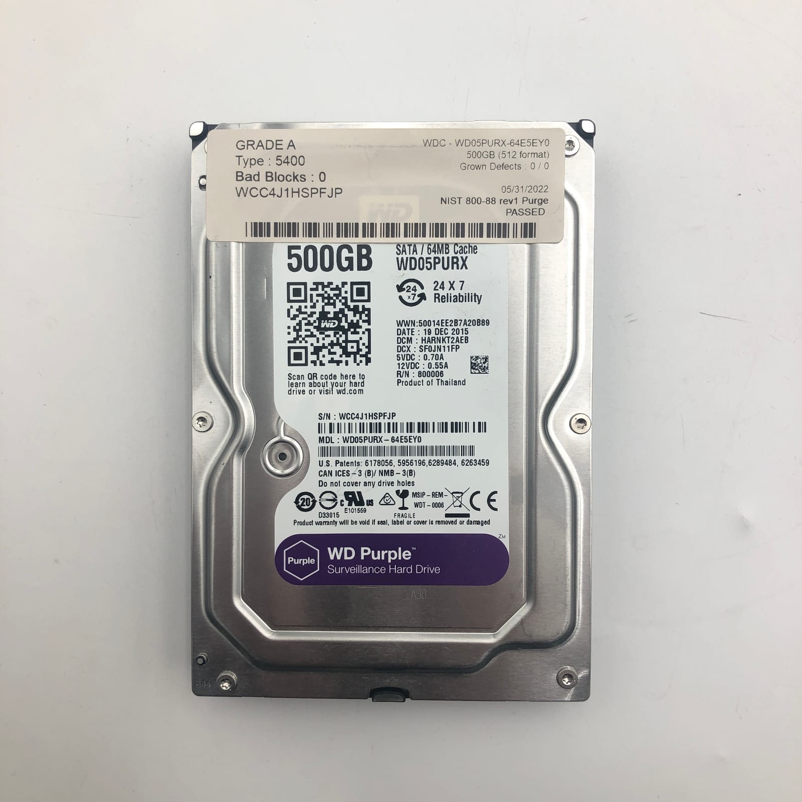 This listing covers 1 individually tested, 500GB WD05PURX-64E5EY0 drive. Every unit meets all of the following floor-guarantee criteria before shipping: