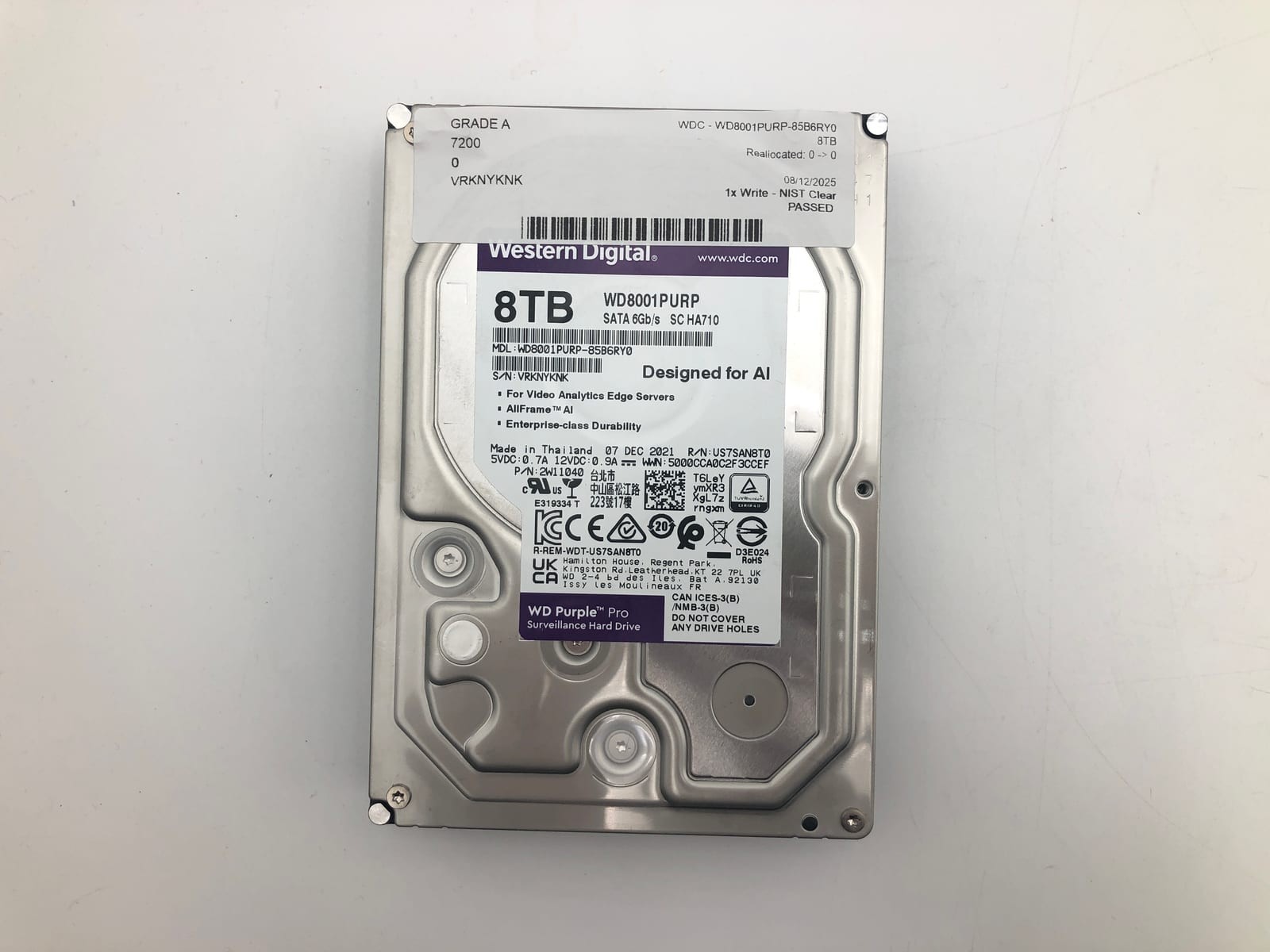 This listing covers 2 individually tested, 8TB WD8001PURP-85B6RY0 drives. Every unit meets all of the following floor-guarantee criteria before shipping: