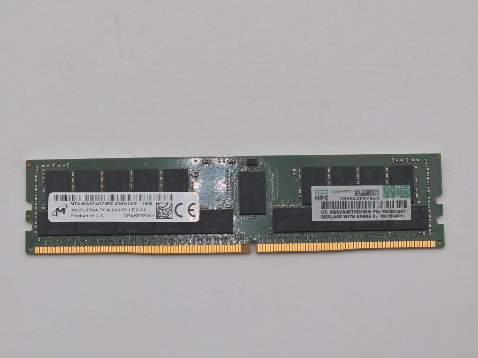 Manufactured by Micron and labeled under HPE spare P06189-001, this module operates at 2933MHz (PC4-23466 / PC4-2933Y)