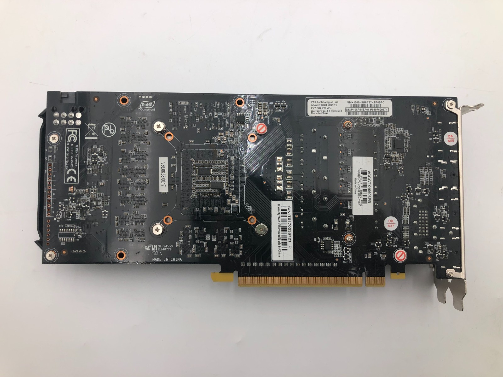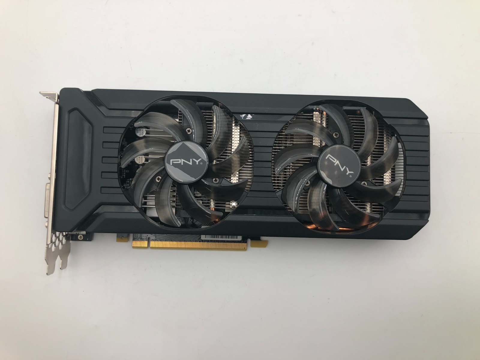 This PNY GeForce GTX 1060 6GB graphics card provides dependable 1080p performance with efficient dual-fan cooling. The unit has been tested using software tools to verify key GPU functions and video output. Cosmetic condition is rated C4, indicating normal signs of use such as minor scratches or surface marks but no missing parts or damage. The card has been cleaned and is ready for installation in any compatible system.
