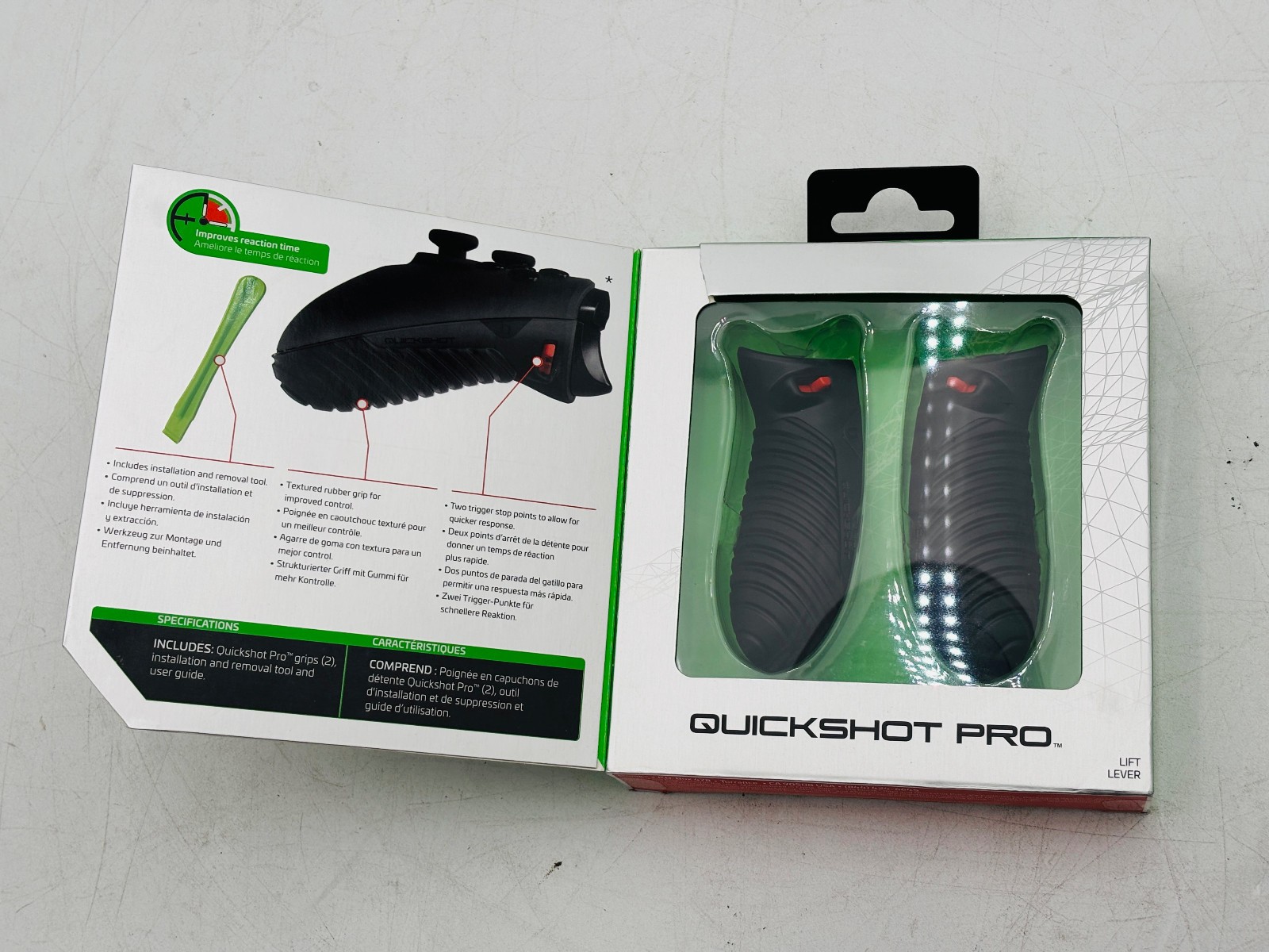 Upgrade your Xbox One controller with the Bionik Quickshot Pro (BNK‑9076), a high‑performance grip and trigger enhancement for precision gaming. The dual‑setting trigger locks reduce trigger travel for faster response, while the textured rubber grips offer a secure, comfortable hold. Perfect for competitive shooters or long gaming sessions. This unit is brand new in its original factory‑sealed box. The outer box has cosmetic wear (scuffs and dents), but contents are untouched and ready to use.