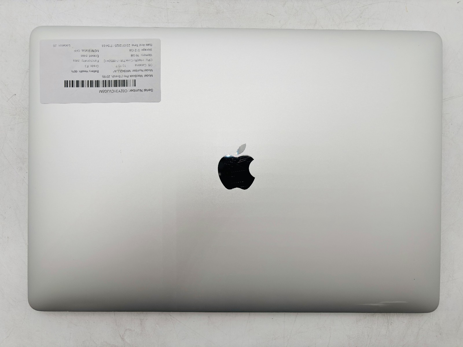 - Functional tests passed: Wi‑Fi, battery, ports, keyboard, trackpad, webcam, speaker, mic, Bluetooth, touch ID, display, and more.