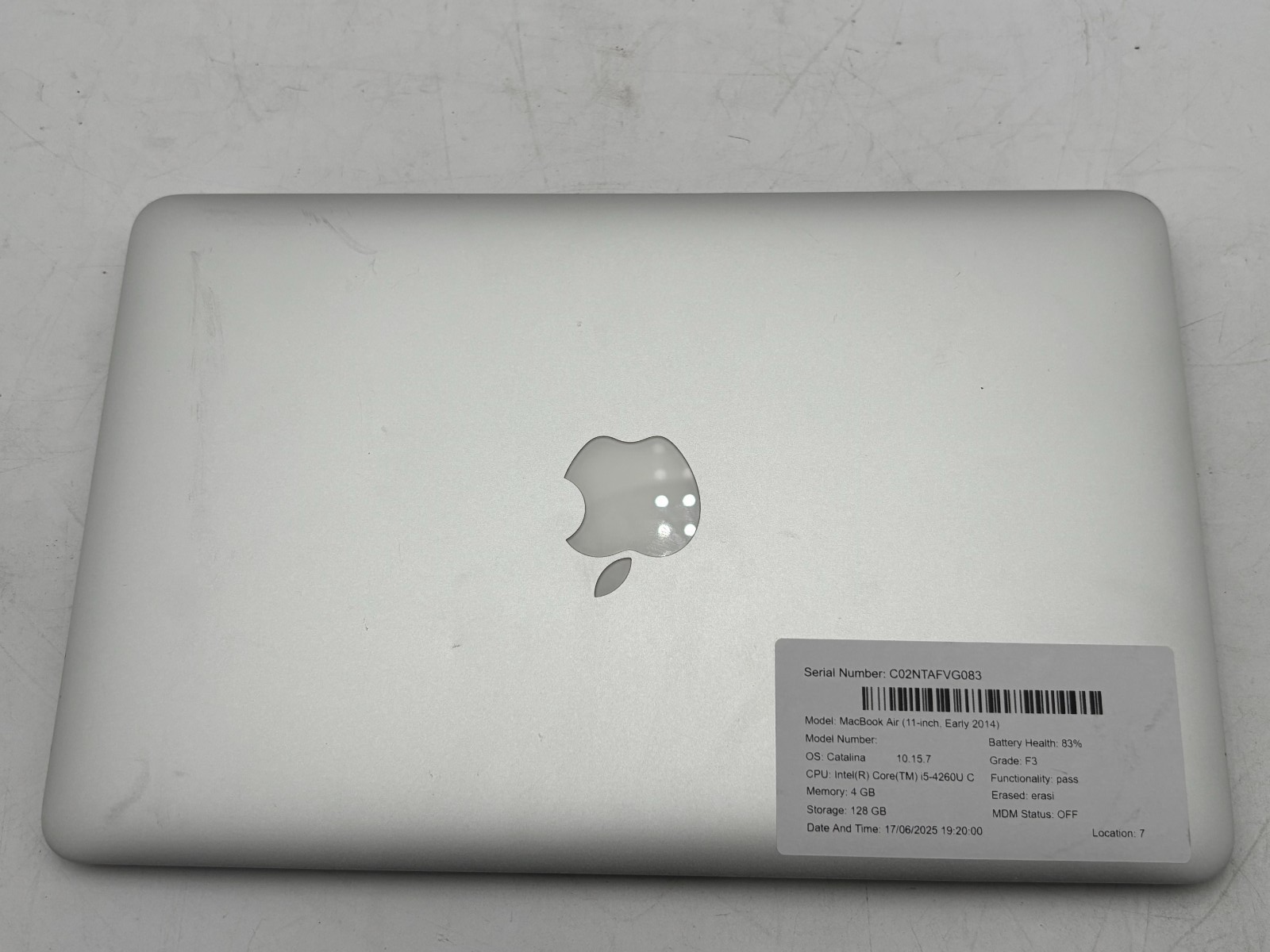 This listing is for an Apple MacBook Air (11-inch, Early 2014). Lightweight and compact, this model is perfect for basic productivity, browsing, and streaming. It features a 4th Gen Intel Core i5 processor, fast SSD storage, and is running macOS Catalina. All hardware components have passed functional testing and the system has been securely erased using NIST 800-88 standards. The battery health is excellent at 83%.