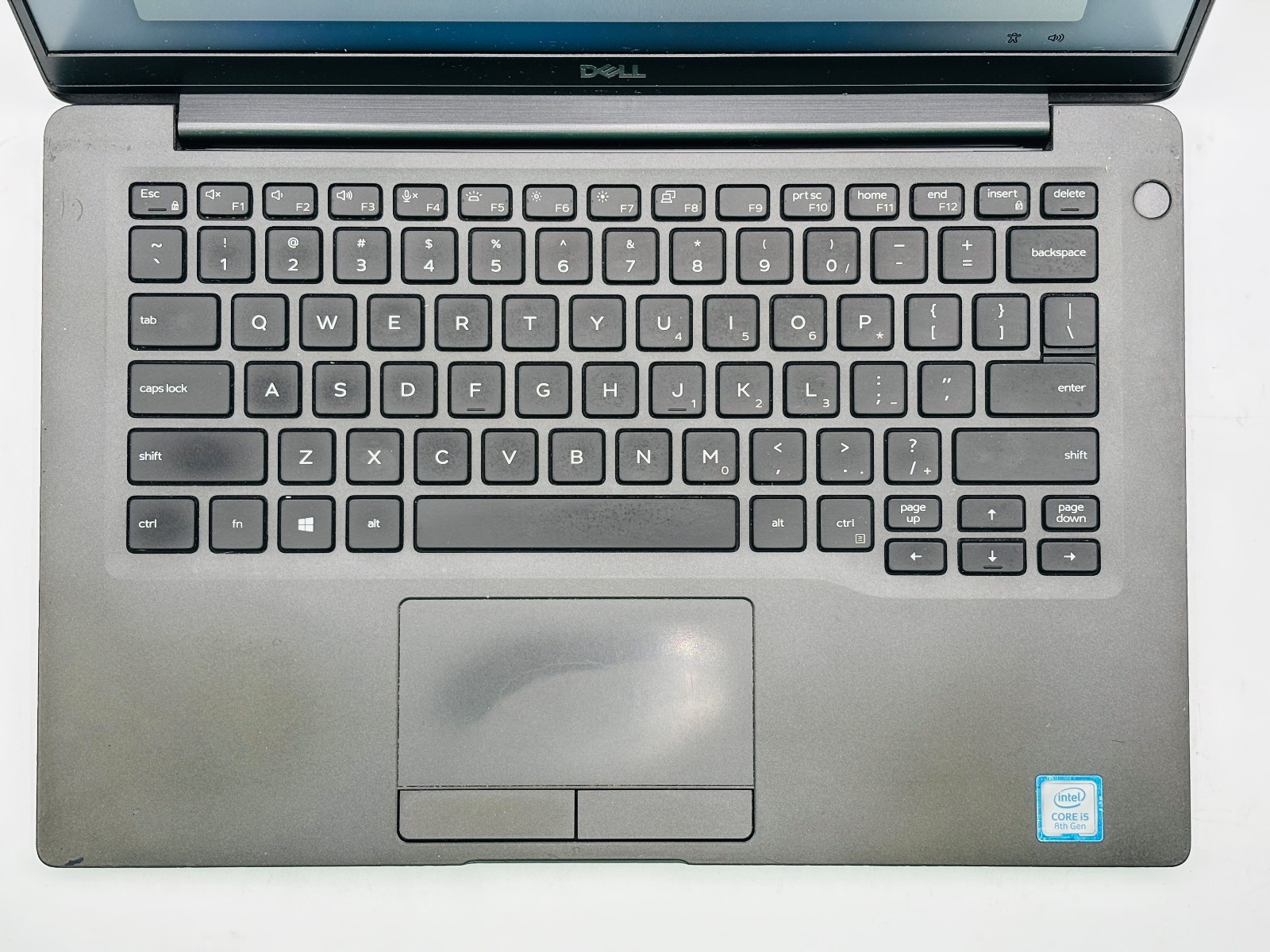 This unit shows moderate cosmetic wear consistent with regular use. The bottom case is missing footpads. The outer case has light scratches. There is visible wear around the keyboard and trackpad area. The display has dot scratches caused by keyboard contact when the lid is closed. These cosmetic issues do not prevent the system from functioning but are clearly present.