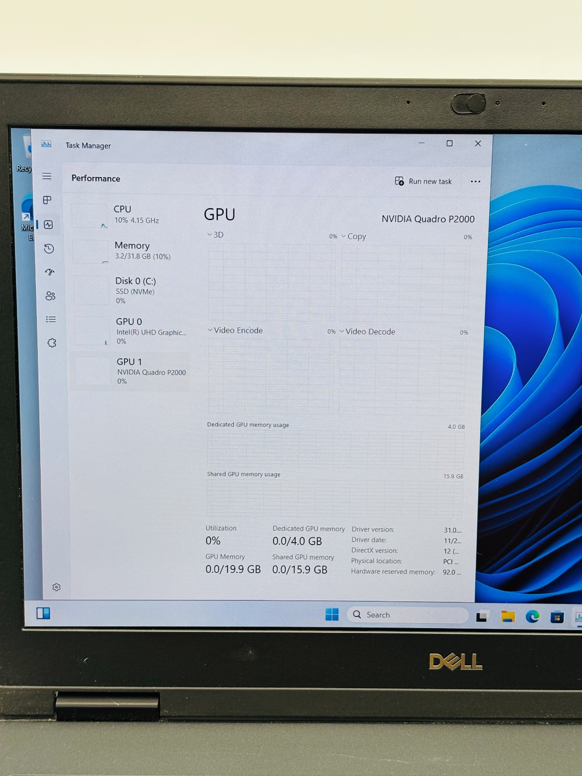 - Video / GPU: NVIDIA Quadro P2000 Mobile 4GB (Dedicated) and Intel UHD Graphics 630 (Integrated)