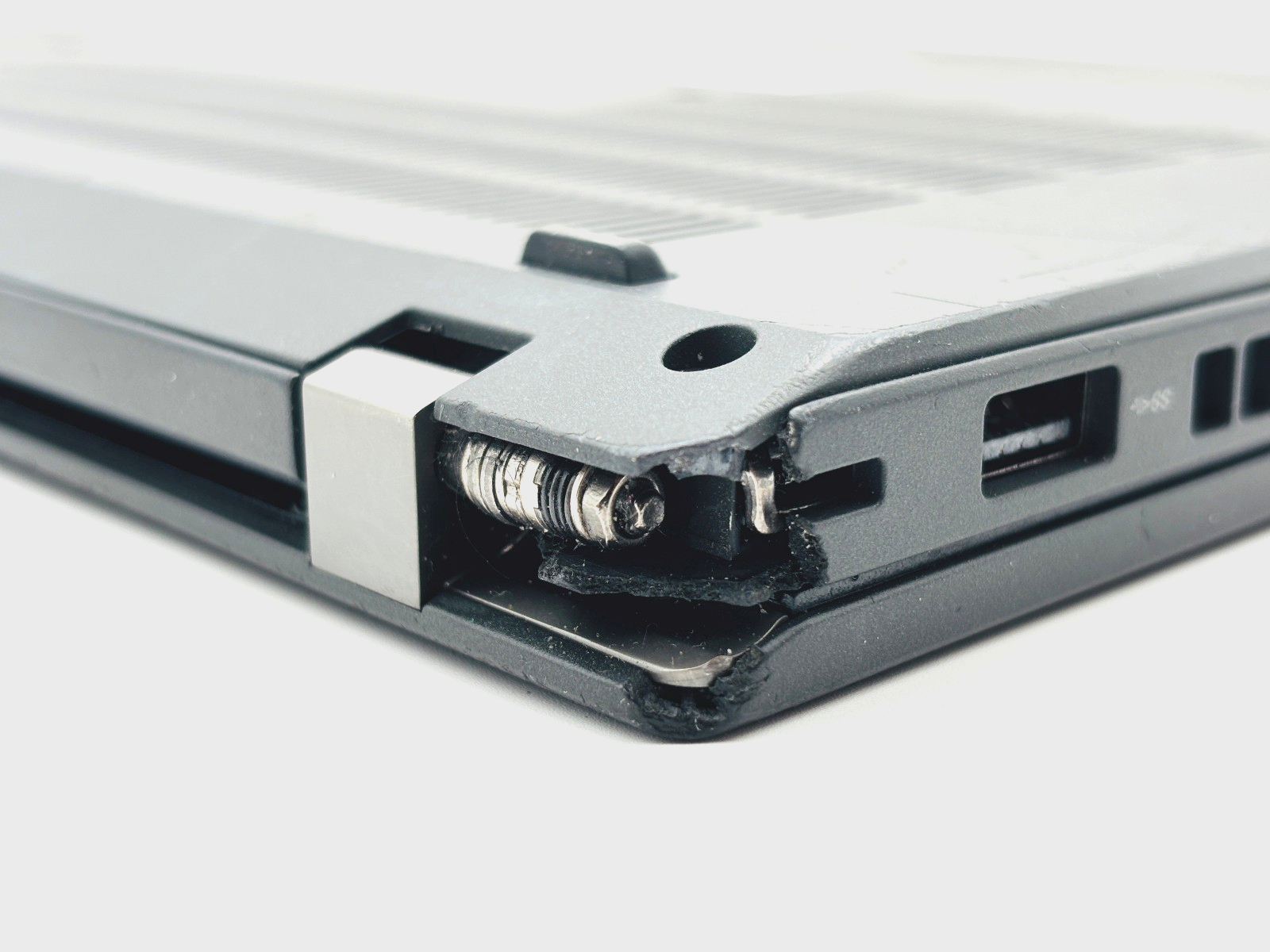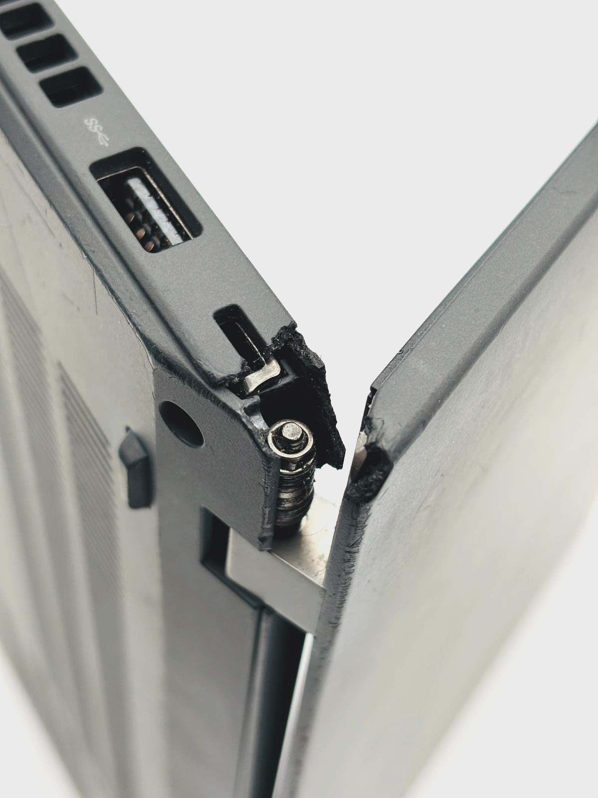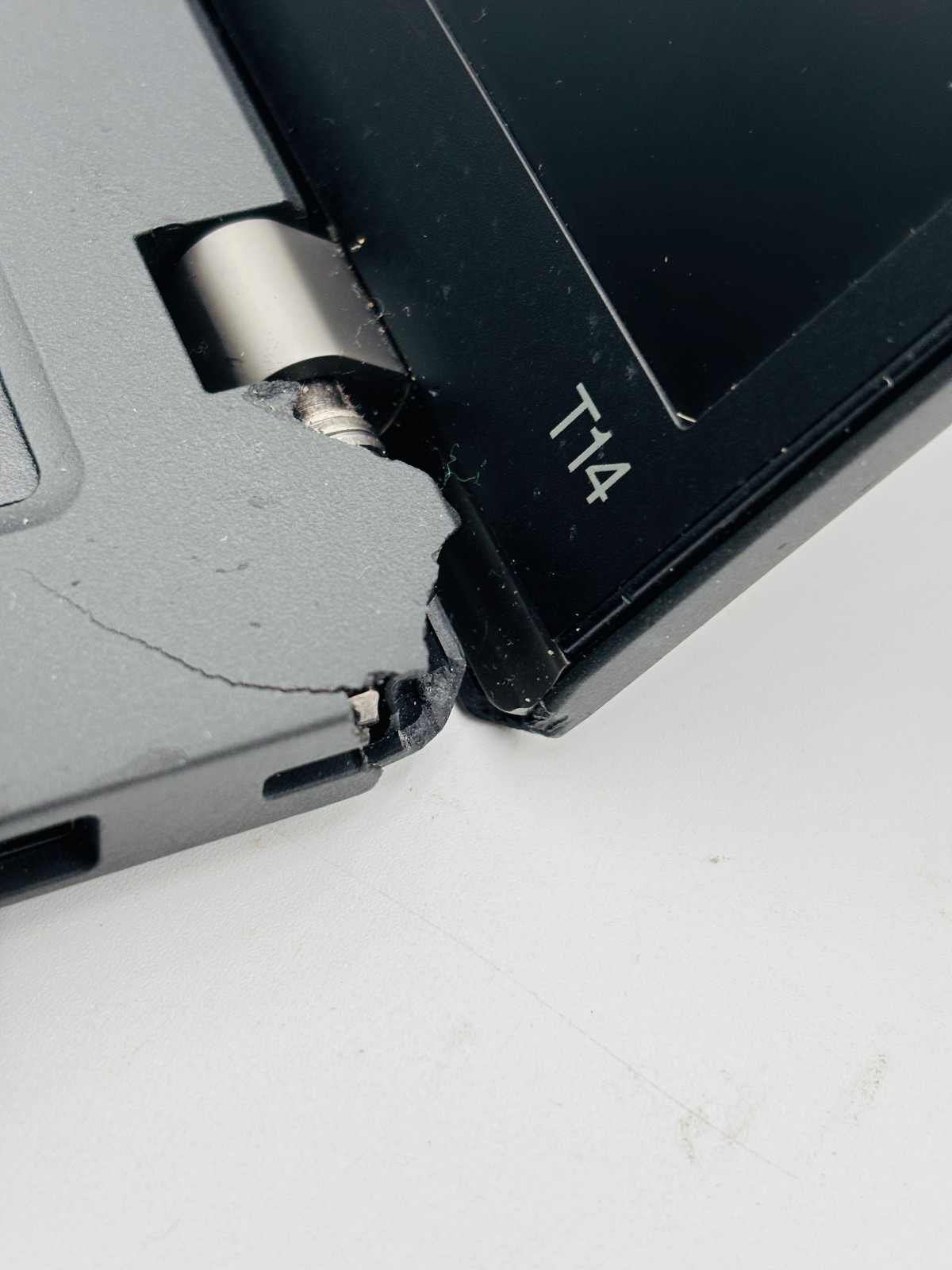 - Cosmetic Condition: Used Fair (C3). Light scratches present. Rear corner is damaged with missing material and the hinge is exposed. Display has surface scratches caused by keyboard contact.