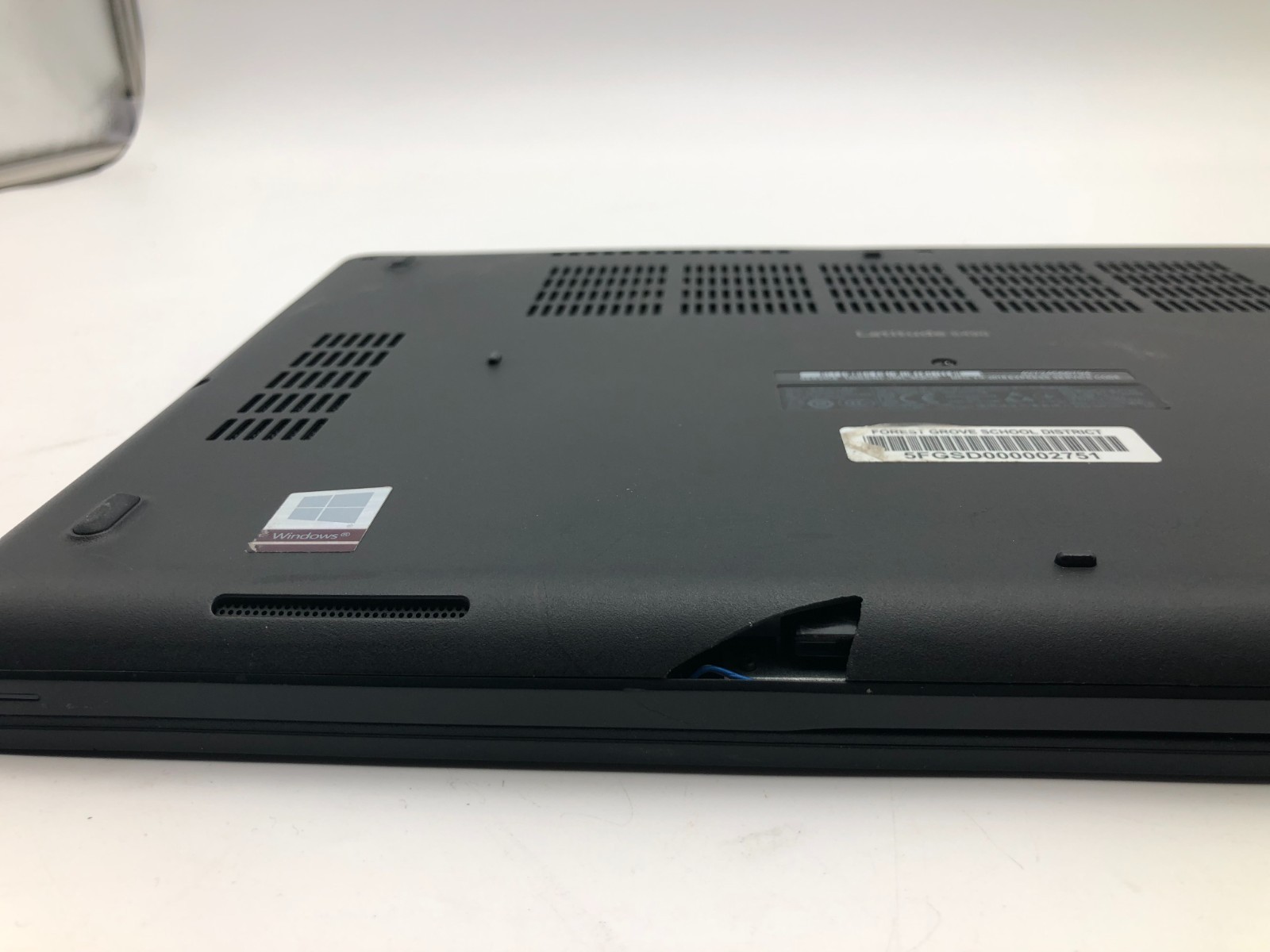 - Condition Notes: Light cosmetic wear from normal use. Bottom cover has a broken or missing plastic section near the hinge area exposing internal cabling. Display hinge is loose. Keyboard and touchpad show visible wear.