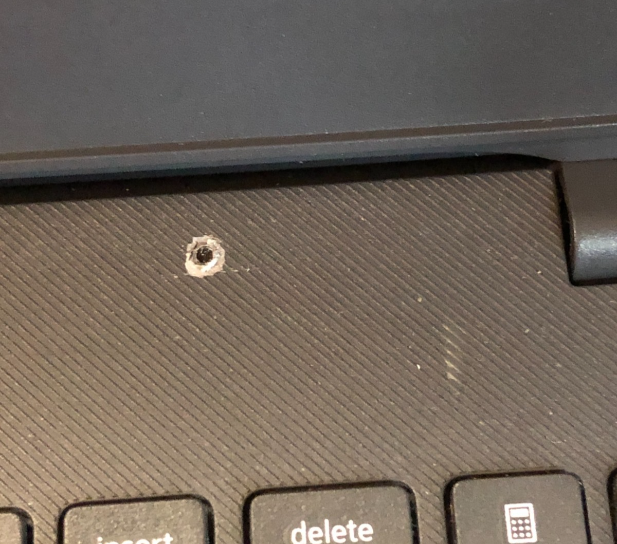 There is a small hole on the keyboard casing near the right hinge, and the exterior shows scratches and light discoloration.