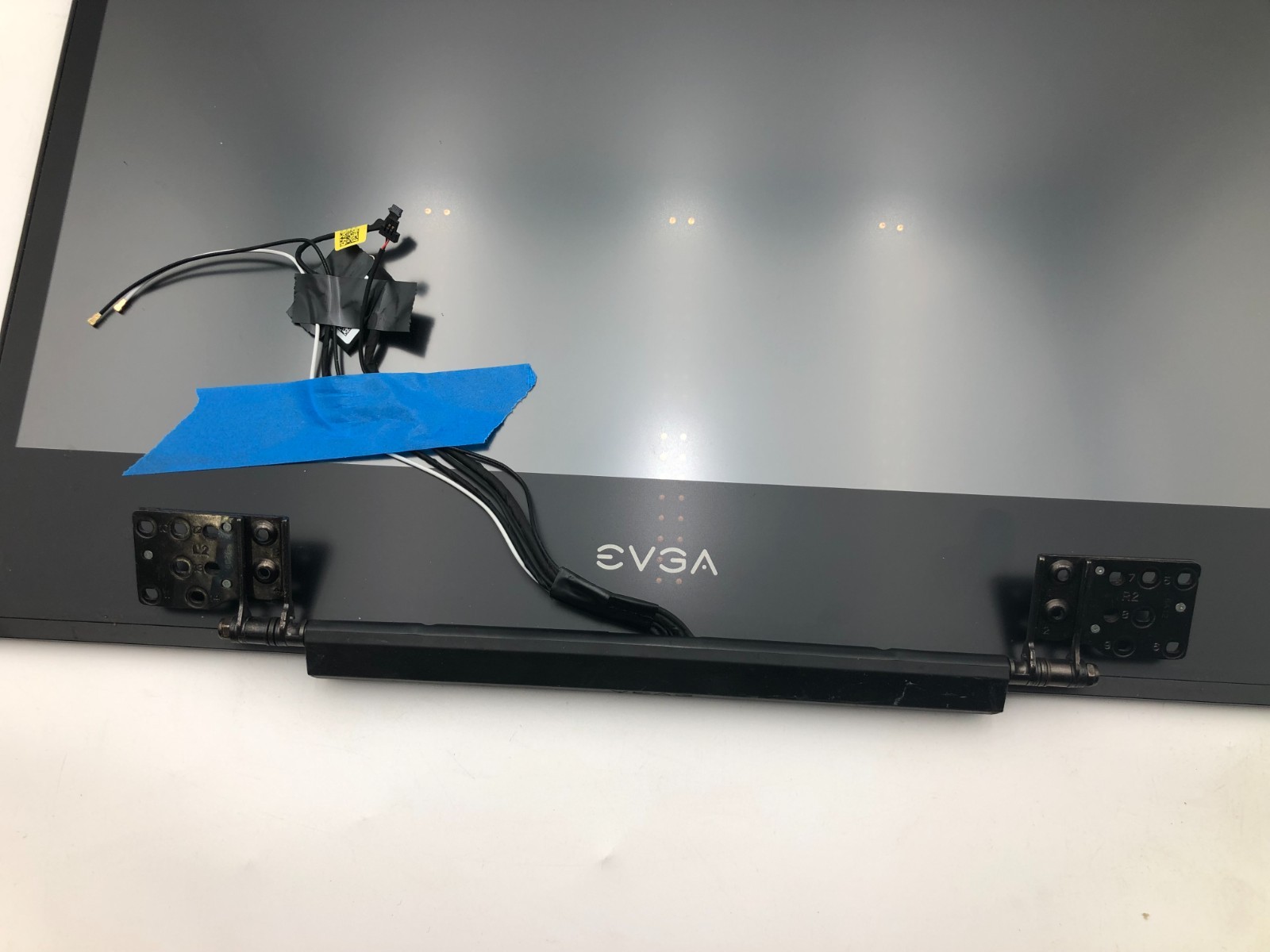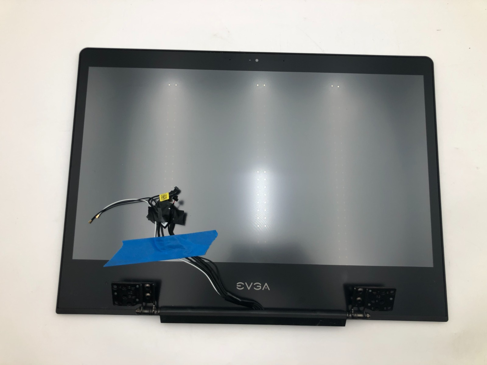 This is a genuine EVGA SC17 17.3″ 4K UHD laptop display assembly. It includes the LCD panel, bezel, hinges, and all internal components that normally remain installed when removing the display from the SC17 chassis. The integrated webcam is present, along with antenna cables, the display eDP cable, the webcam/microphone cable, and multiple EVGA internal modules. This assembly was removed from a functioning system and is suitable for SC17 repairs or part harvesting.