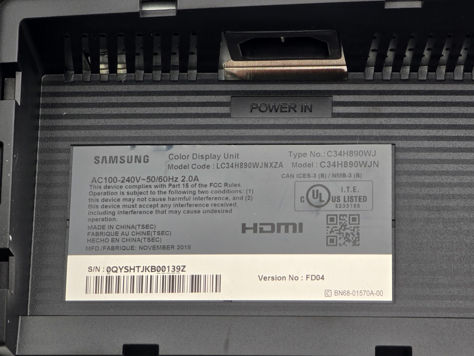 - Model: Samsung C34H890WJN (C34H890WJXZA)