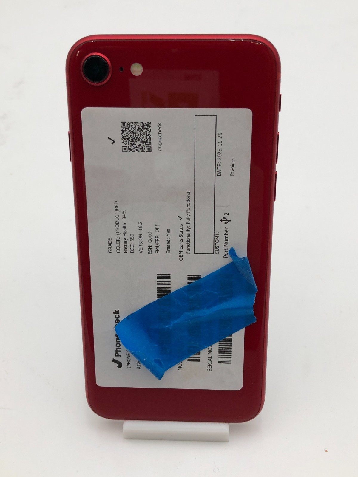 This Apple iPhone 8 (64GB, PRODUCT(RED), model MRRP2LL/A) is a reliable and compact smartphone option with all key functions tested and confirmed working. Locked to AT&T, it has no blacklist, MDM, or financial lock. The battery is original with 84% health and 550 cycles. Cosmetic grade C4 means some visible wear like light scratches or signs of prior use. This model features a fingerprint sensor, 4.7-inch Retina HD display, and Touch ID home button. Securely erased to NIST 800-88 standards and ready for resale.