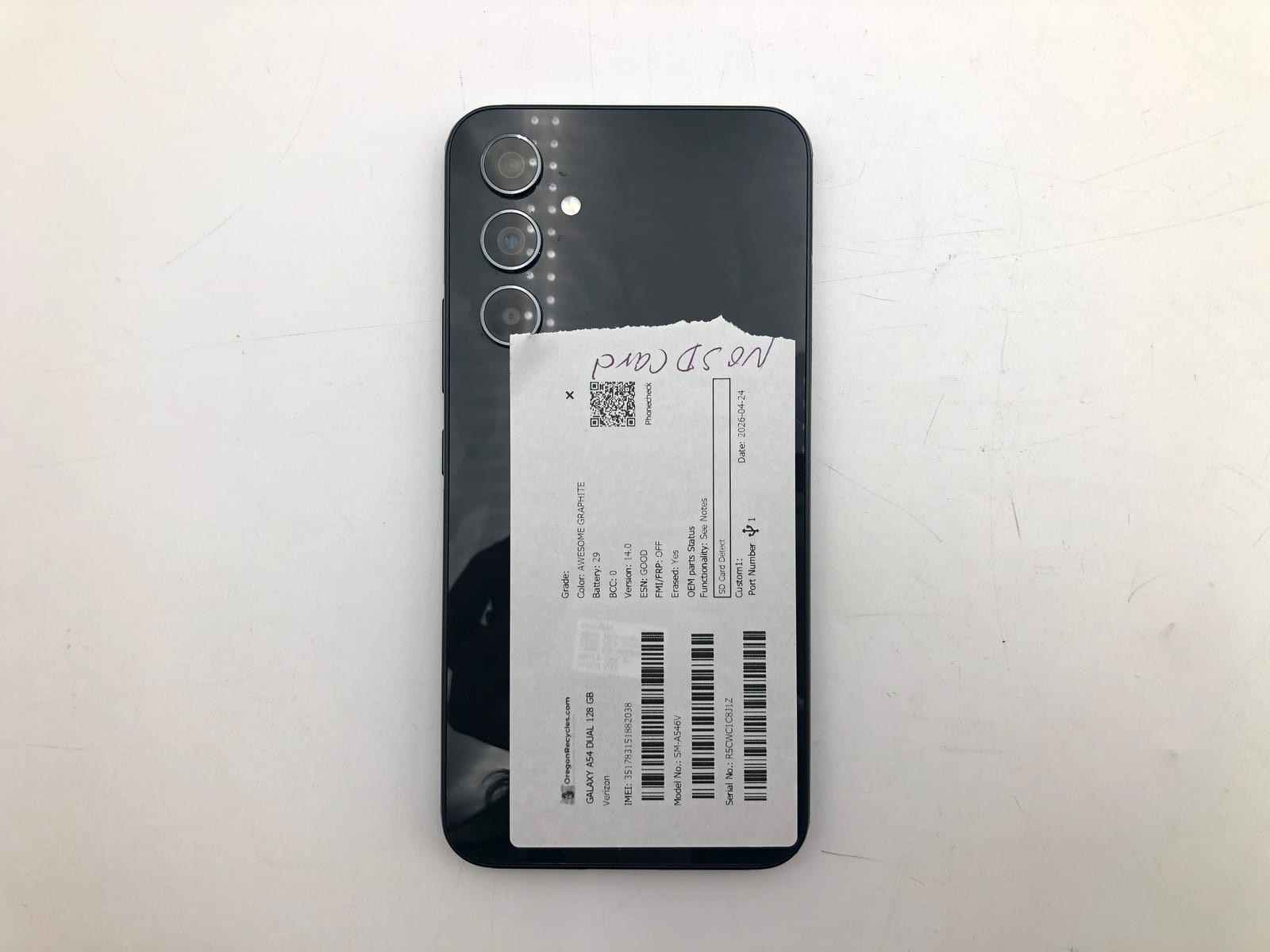 This Galaxy A54 Dual system is equipped with 128GB of storage and runs Android 14.0. Fully tested by trained technicians; passes and noted observations are called out in detail below.