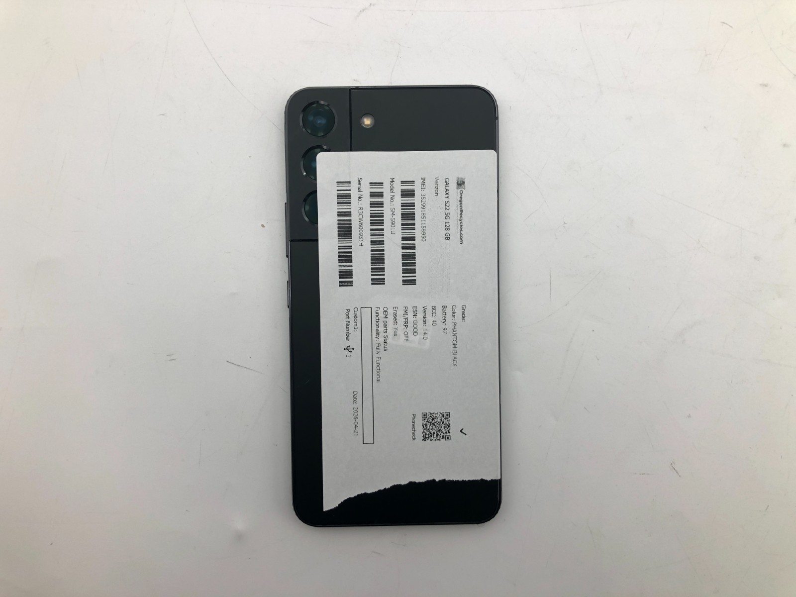 This Galaxy S22 5G system is equipped with 128GB of storage and runs Android 14.0. Fully tested by trained technicians; passes and noted observations are called out in detail below.