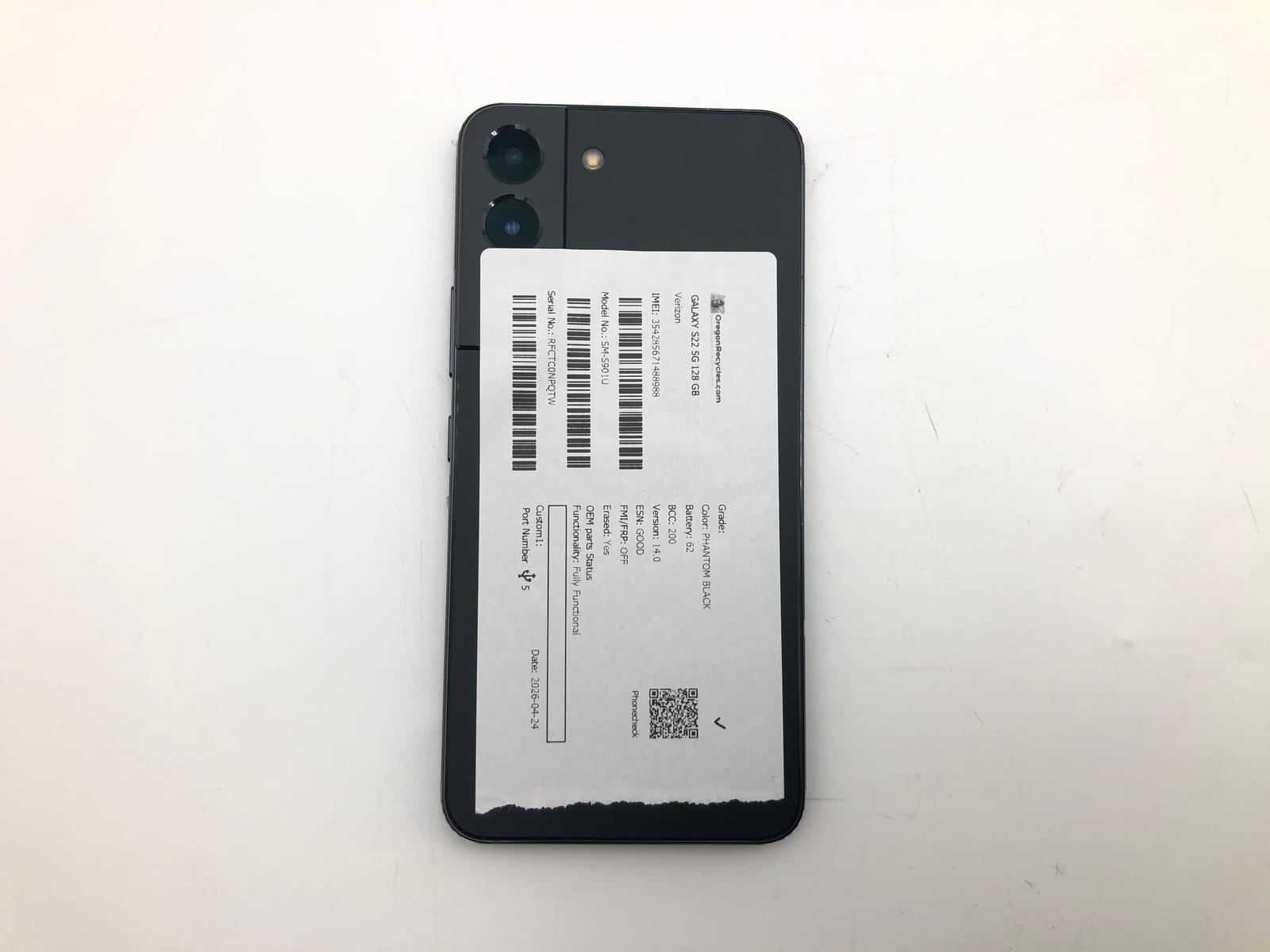 This Galaxy S22 5G system is equipped with 128GB of storage and runs Android 14.0. Fully tested by trained technicians; passes and noted observations are called out in detail below.