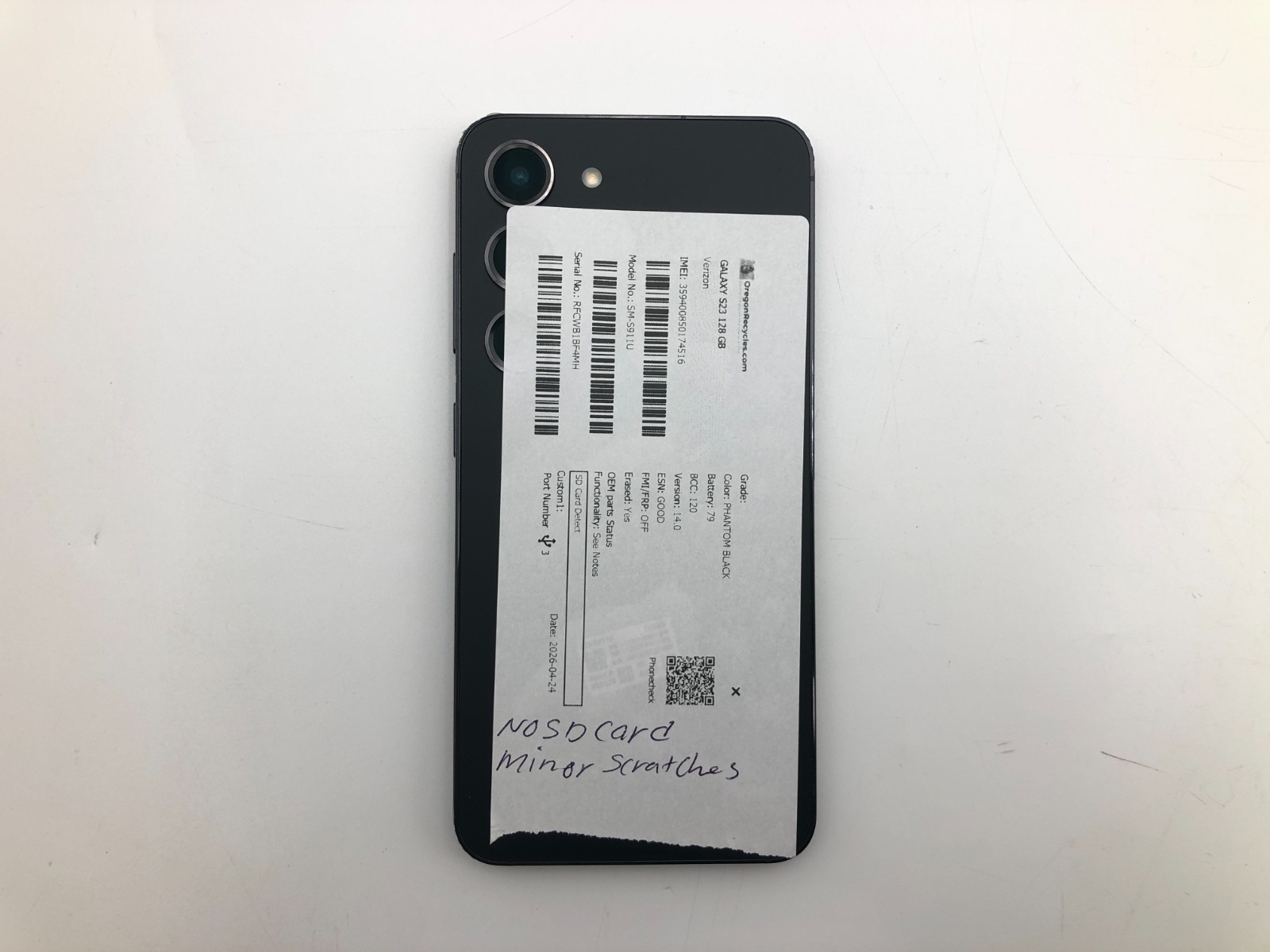 This Galaxy S23 system is equipped with 128GB of storage and runs Android 14.0. Fully tested by trained technicians; passes and noted observations are called out in detail below.