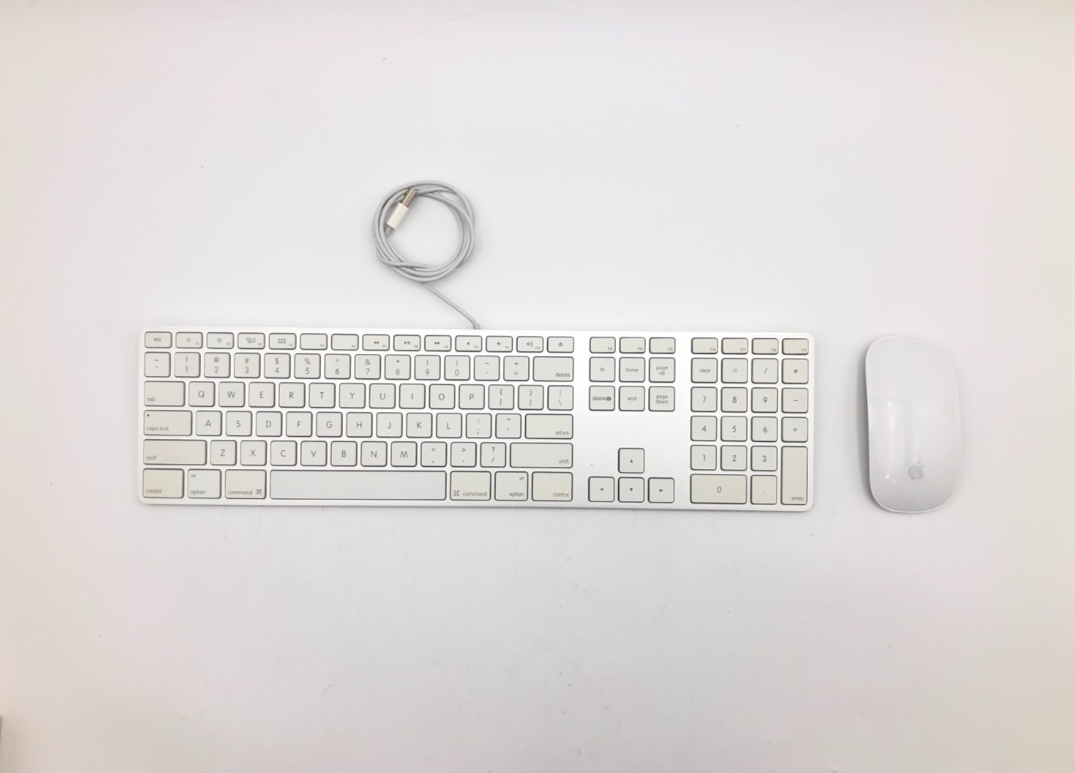 This is a mixed accessory bundle and not a factory-original paired set. The keyboard is wired via USB, while the mouse is wireless and rechargeable via Lightning. No cables or manuals are included. Cosmetic condition may vary slightly between units.