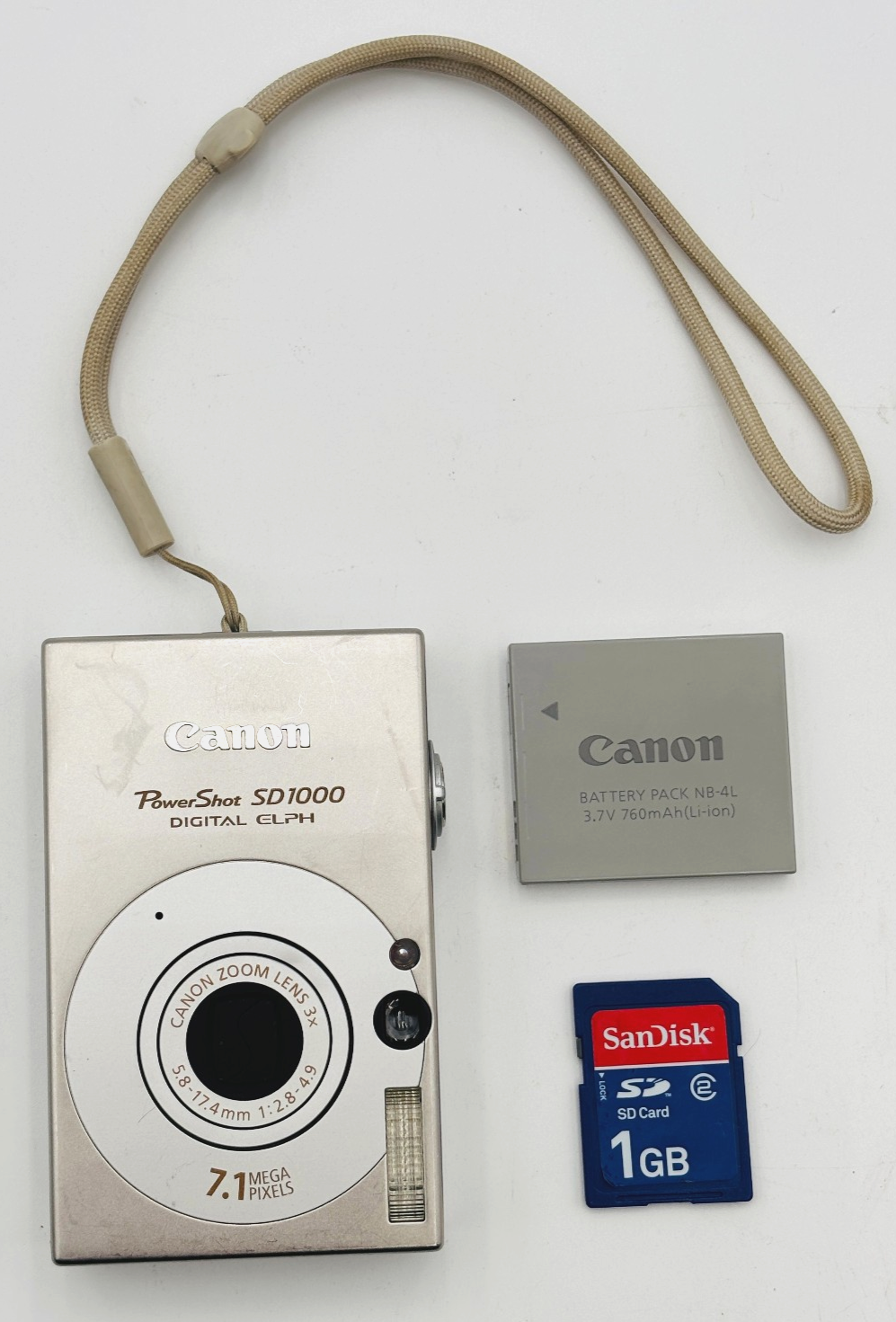 This listing is for a Canon PowerShot SD 1000 Digital ELPH in silver. This compact digital camera, despite its age, remains fully functional and is capable of capturing both photos and videos. It’s powered by Canon’s DIGIC III processor and features a 3x optical zoom lens. This unit is ideal for collectors, retro tech lovers, or those seeking a simple, reliable point-and-shoot digital camera.