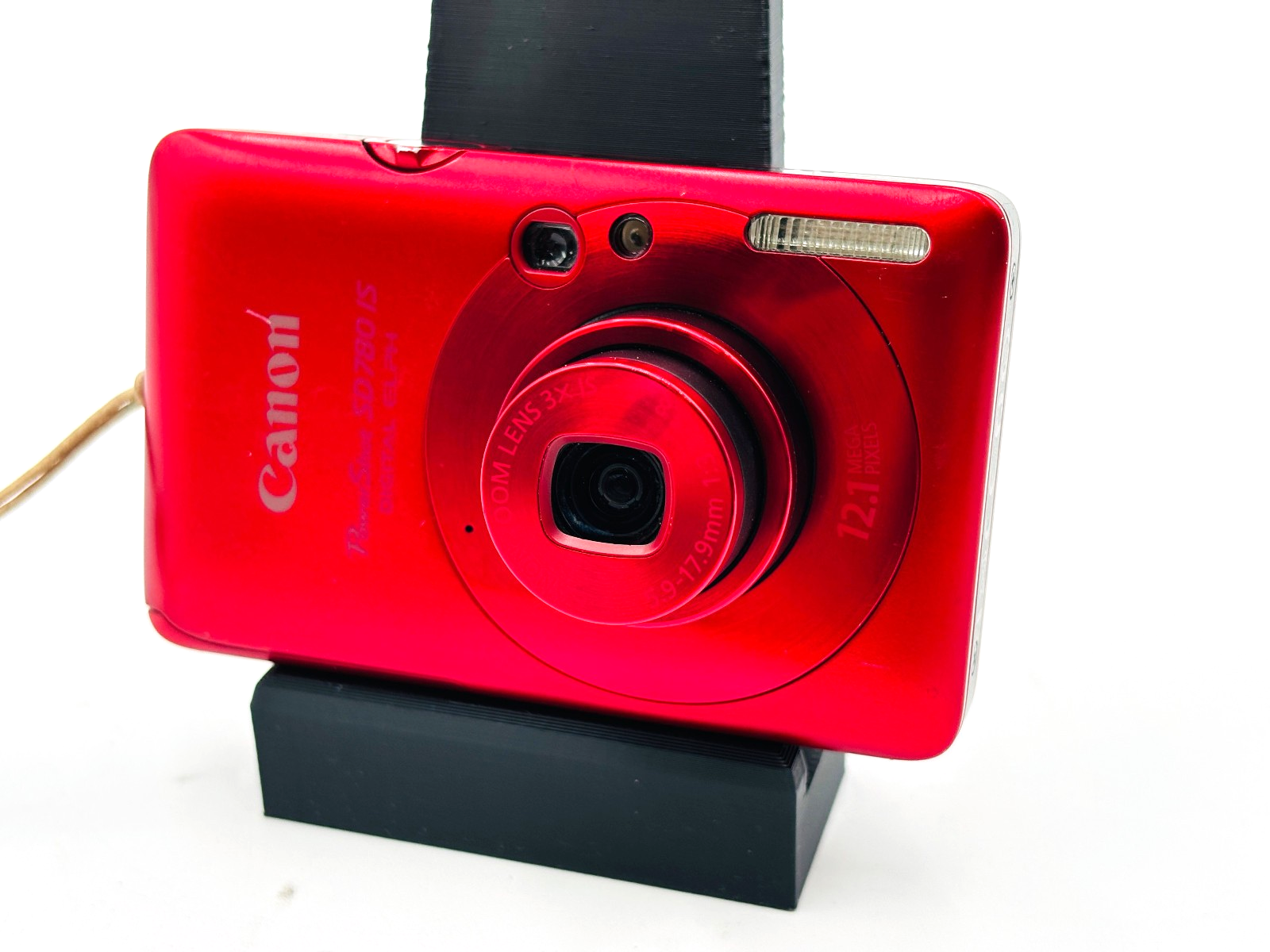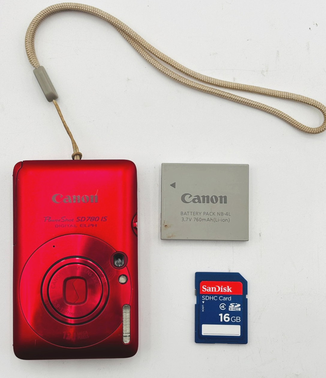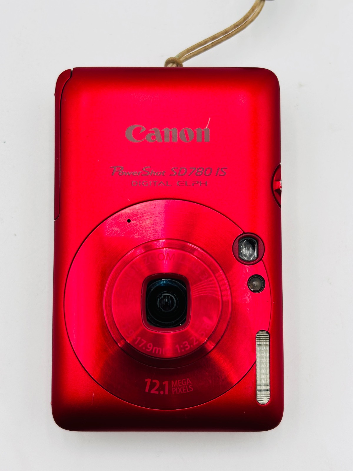 This Canon PowerShot SD780 IS in red is a stylish and ultra-compact digital camera perfect for casual photography or as a backup travel cam. With a 12.1MP CCD sensor and 3x optical zoom, it delivers sharp images and HD video. The built-in flash and multiple smart detection modes help capture great shots in any condition. Despite some cosmetic wear — including a dent around the lens housing, dust in the viewfinder, and a small dead spot on the LCD — the camera has been fully tested. It functions properly, taking both photos and videos with stable image storage on the included 16GB SD card. All controls are responsive, and the battery retains charge well even after days of standby. A solid pick for someone seeking a functional point-and-shoot camera on a budget.