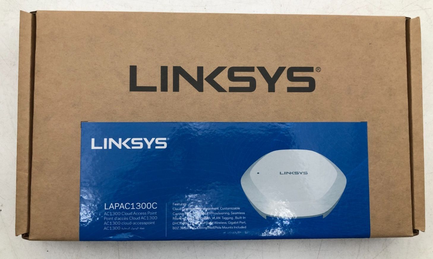 This listing is for a Linksys LAPAC1300C cloud‑managed AC1300 WiFi 5 access point in New Open Box condition. Ideal for business deployments, this unit offers high‑speed dual‑band performance, PoE installation flexibility, and remote cloud management for one or multiple sites.