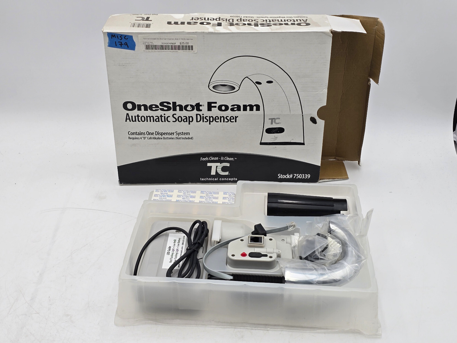 Enhance your facility’s hygiene with the Rubbermaid OneShot Foam Dispenser, model 750339. This hands-free, automatic dispenser is designed to minimize the spread of germs while delivering a precise amount of foam soap, making it perfect for commercial restrooms. The polished chrome finish and compact design allow for seamless integration into any space. This is an open box item; the packaging shows some damage, but the unit itself is unused and unaffected. Ideal for businesses, schools, or healthcare facilities seeking a durable and efficient soap dispensing solution.